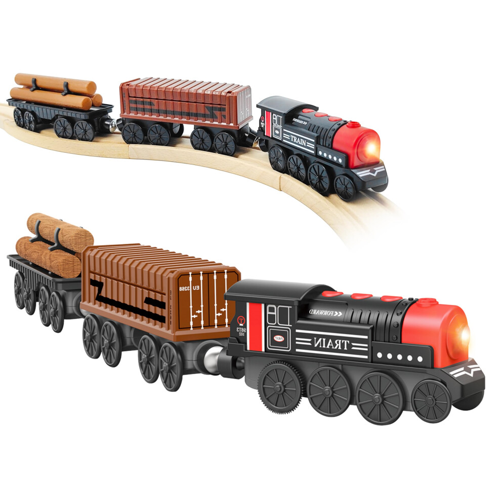 Battery Train for Wooden Track - 3 Pcs Magnetic Retro Battery Operated Light Up Train Toys, Wooden Train Track Accessories for 3+ Toddler Kid Boy Girl Birthday Christmas Halloween TOY 0604