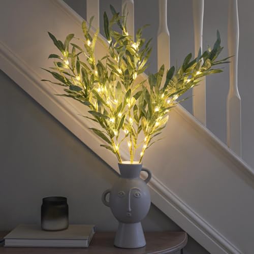 Festive Lights - 3 x 65cm Decorative Olive Leaf Branch Lights (1 Pack) with 60 Warm White LEDs - Battery Powered Indoor Foliage, Green Design, Timer Function, Clear Cable, Twig Style Vase Display
