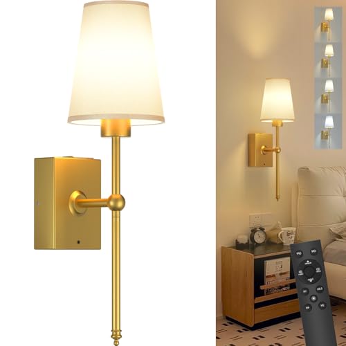 MOITA Battery Operated Wall Lights Set of 2, Rechargeable Wall Sconces, Gold Wall Lamp with Remote 3 Color Temperature Dimmable Battery Powered Non Hardwired Wall Light for Bedroom Living Room
