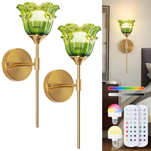 Vloitgol Vintage Battery Operated Wall Lights with Green Glass Lampshade Wireless Rechargeable Battery Powered RGB Wall Light with Remote Control for Indoor Bedside Bedroom Hallway LivingRoom, 2-Pack