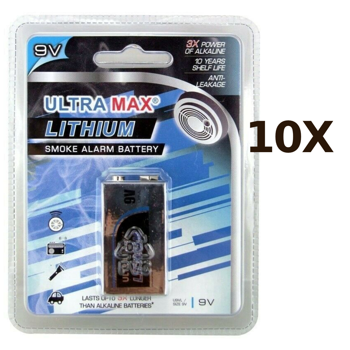 10X ULTRAMAX 9v Lithium Battery Smoke Alarm Detector Block PP3 Blister Pk MN1604