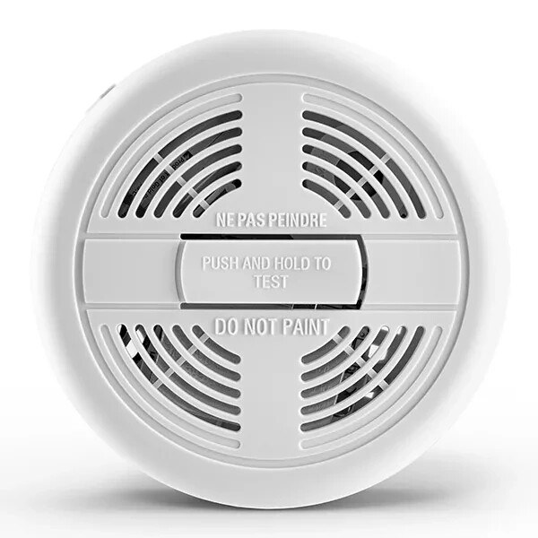 Combined carbon monoxide smoke detector, battery-powered smoke detector with LED display, flashing alarm mode, and audible warning.