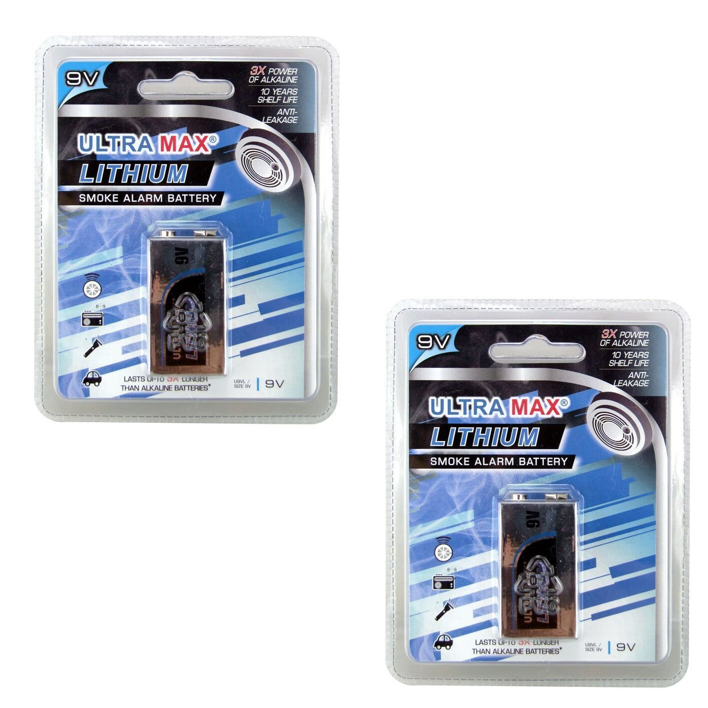 2X ULTRAMAX 9v Lithium Battery Smoke Alarm Detector Block PP3 Blister Pk MN1604