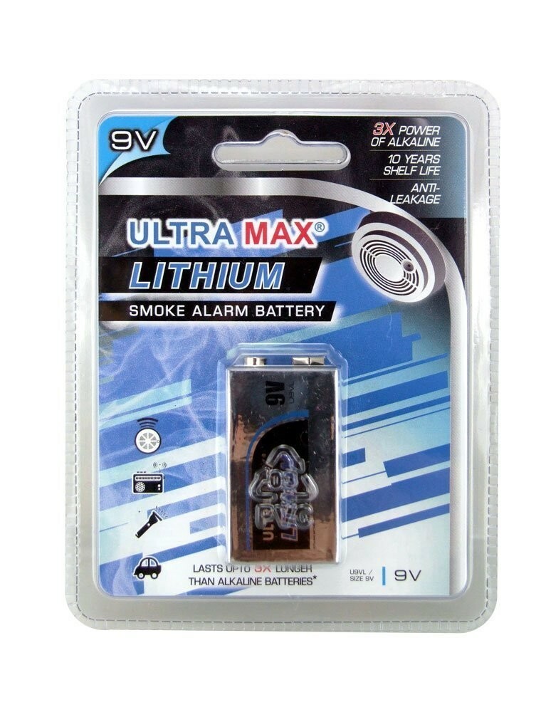 ULTRAMAX 9v Lithium Battery Smoke Alarm Detector Block PP3 Blister Pk MN1604