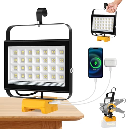 T-SUN Cordless LED Work Light for Dewalt 18V Battery, 60W Portable Jobsite Flood Light with USB Charging Port, Indoor Outdoor Flashlight Spotlight for Camping/Emergency/Garage/Repairing(No Battery)