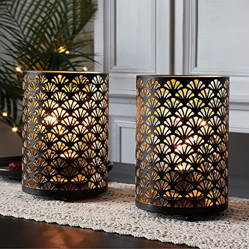 TRIROCKS Set of 2 Battery Operated Table Lamp 12cm x 16cm Metal Cordless Bronze Lanterns with Warm Lights Bulb for Patio Wedding Parties Indoor Outdoor (Scalloped Hollow Pattern)
