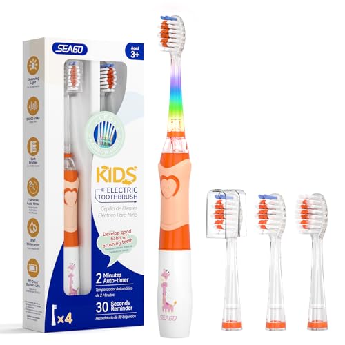 Seago Kids Electric Toothbrush, Battery Powered Toothbrushes for Childrens with Timer, Rainbow LED Light, 4 Brush Heads, Soft Bristles, Fun for Boys and Girls Aged 3 Years and Up, SG977 (Orange)