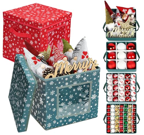 Anstore 2 Pack Christmas Bauble Storage Box, Bauble Storage Box with Trays & Adjustable Dividers, Stackable Non-Woven Fabric Baubles Storage Bags, 83pcs 5-9cm Xmas Ornament Organiser with Carry Handle