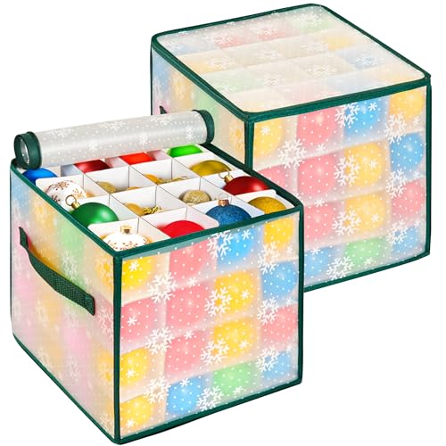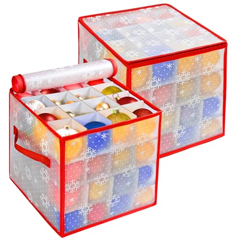 Enipate 2 Pack Christmas Bauble Storage Box Cube With Dividers, Foldable Clear Xmas Ornaments and Decorations Container, Stores up to 64 Baubles, 4 Layer Holder with Card Slot, Zipped Lid & 2 Handles