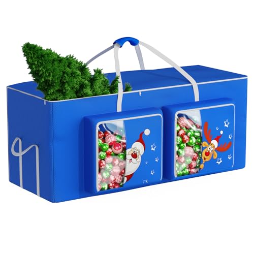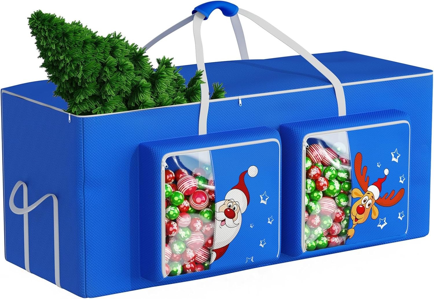 Alupssuc Christmas Tree Storage Bag 9ft,Large Bauble Decoration Storage Box,Christmas Ball Storage,600d Oxford Sturdy and Durable,Waterproof Storage Bag,Side Pocket Store With Cute Pattern-Blue