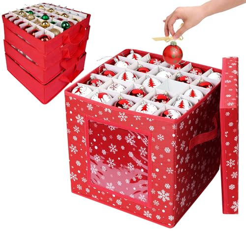 Anstore Red Christmas Storage Box with Lid, 4-Tier Bauble Storage Box with Adjustable Dividers, Snowflake Non-Woven Fabric Decoration Storage, 5-9cm Ornament Organiser with Carry Handles Bauble Box