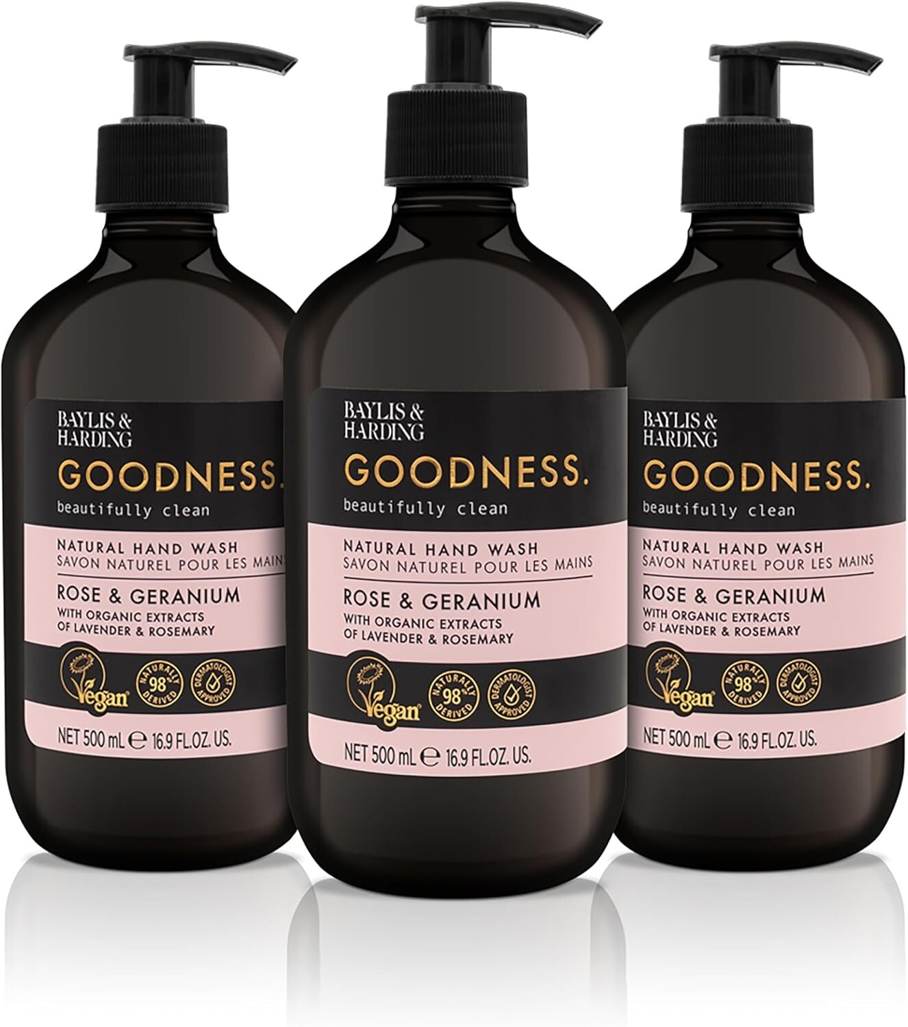 Baylis & Harding Goodness Rose & Geranium Natural Hand Wash, 500 ml (Pack of 3) - Vegan Friendly