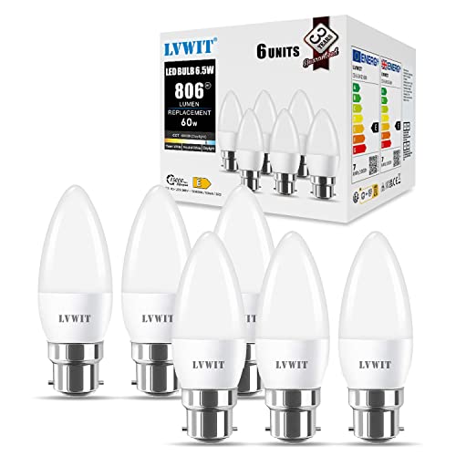 LVWIT B22 LED Candle Bulbs,6.5W B22 Bayonet Candle Bulbs 60W Equivalent,2700K Warm White LED Candle Light Bulb, 806Lm, 240 Degree Beam Angle,220-240V,Non-Dimmable (Pack of 6)