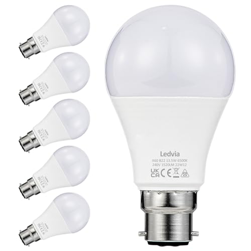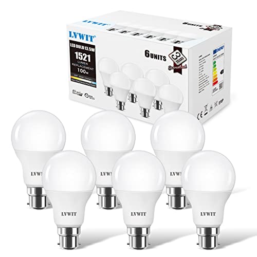 LVWIT Bayonet Light Bulbs 100W Equivalent, Cool White 6500K, 13.5W 1521LM Super Bright Daylight B22 LED Bulbs, BC GLS Energy Saving Light Bulbs, Non-dimmable, Pack of 6