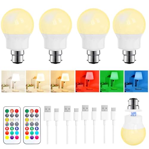 LED Rechargeable Light Bulb with Remote Magnetic B22 Bayonet Battery Light Bulbs, 3 Color Temperature + 9 RGB Colour, 480LM, 3 Timer, for Lights, Lamps Without Power, Camping, Emergency 4 PACK