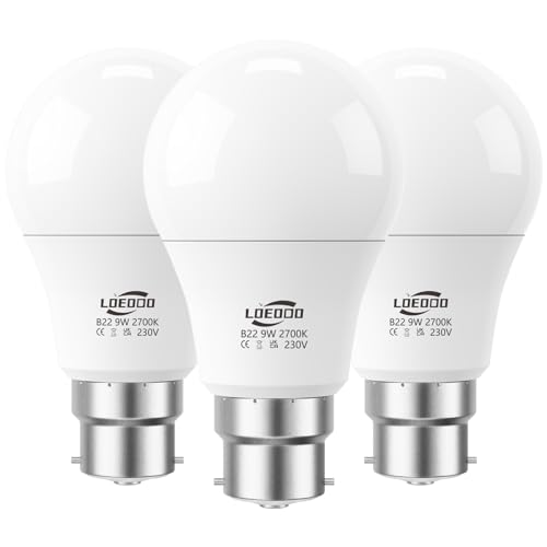 LOEODO Bayonet Light Bulbs 60W Equvialent, 9W 806 Lumens LED Bulb, Warm White 2700K, B22 Energy Saving Lightbulbs, Non-dimmable, Pack of 3