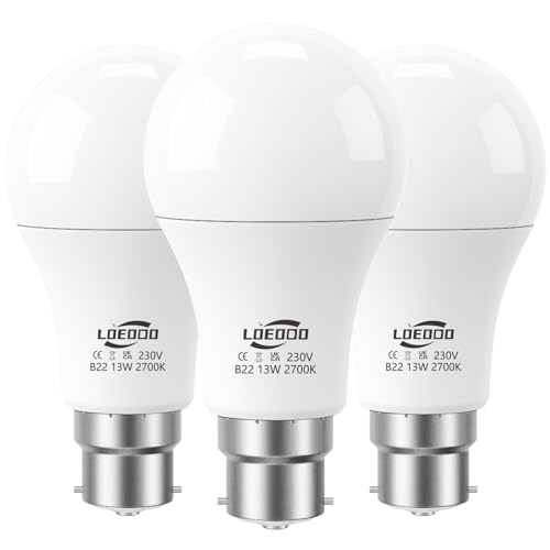 LOEODO B22 Bayonet LED Bulbs 100W Equivalent, 13W Light Bulb, 1200 Lumens, 2700K Warm White, A60 Energy Saving Lightbulbsb, Non-Dimmable, Pack of 3