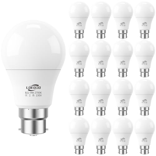 LOEODO Bayonet Light Bulbs 60W Equvialent, 9W 806 Lumens LED Bulb, Warm White 2700K, B22 Energy Saving Lightbulbs, Non-dimmable, Pack of 16