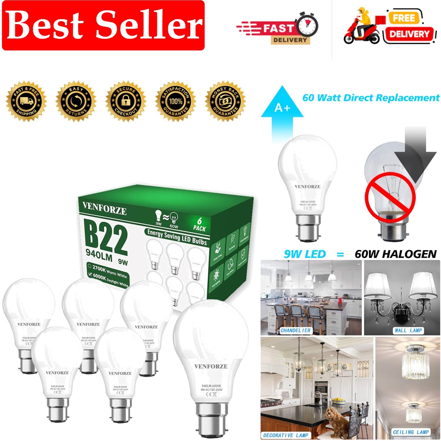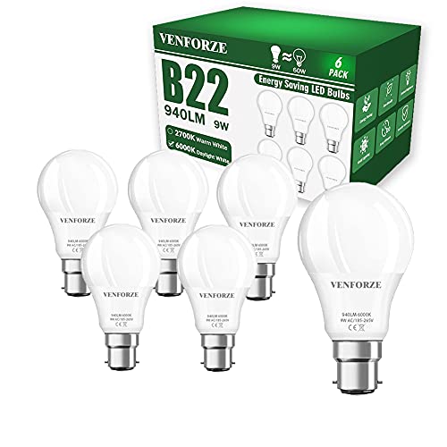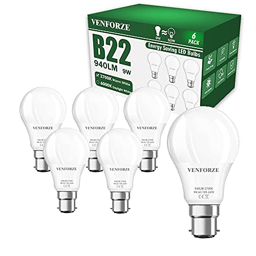 Venforze Bayonet Light Bulbs, 9W(Equivalent to 60W) 2700K Warm White B22 LED Bulb, 940LM A60 Bayonet Bulbs, Non Dimmable BC GLS Energy Saving Light Bulbs, Pack of 6