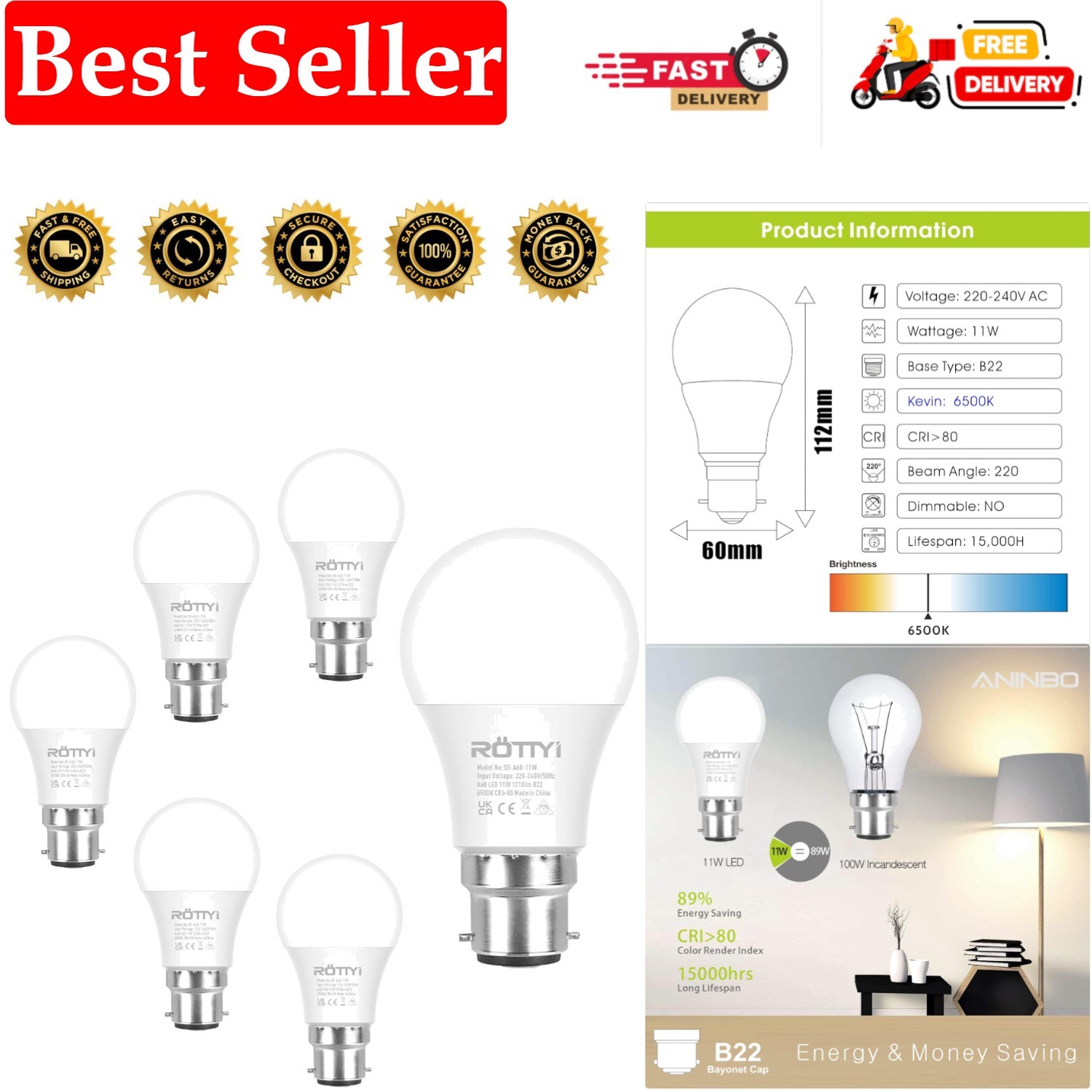 ROTTYI B22 Bayonet Light Bulbs 100W Equivalent, Cool White 6500K Daylight Bulbs, 11W 1210LM LED Bulb, BC A60 GLS Energy Saving Lightbulbs, Classic Shape Non-dimmable, Pack of 6