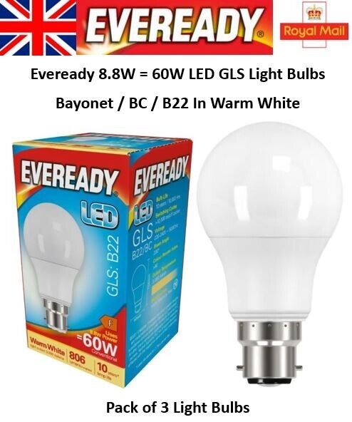 6 x 8.8W = 60W Equiv LED GLS Light Bulbs Bayonet BC B22 Lamp Warm White Eveready