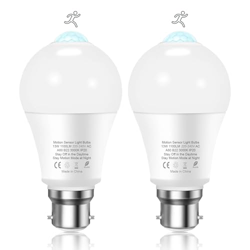 Torkase PIR Motion Sensor Light Bulb, 13W B22 Bayonet Security Light Bulbs, 3000K Warm White Infrared Lamp, Auto On/Off Motion Sensor Lights Indoor Outdoor Bulbs for Garage, Bathroom, Hallway, 2 Pack