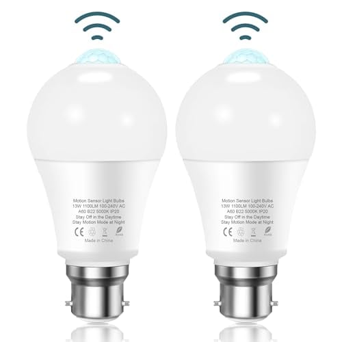 Torkase PIR Motion Sensor Light Bulb, 13W B22 Bayonet Smart Light Bulbs, 5000K Cool White Infrared Lamp, Auto On/Off Motion Sensor Lights Indoor Outdoor Bulbs for Garage, Bathroom, Hallway, 2 Pack