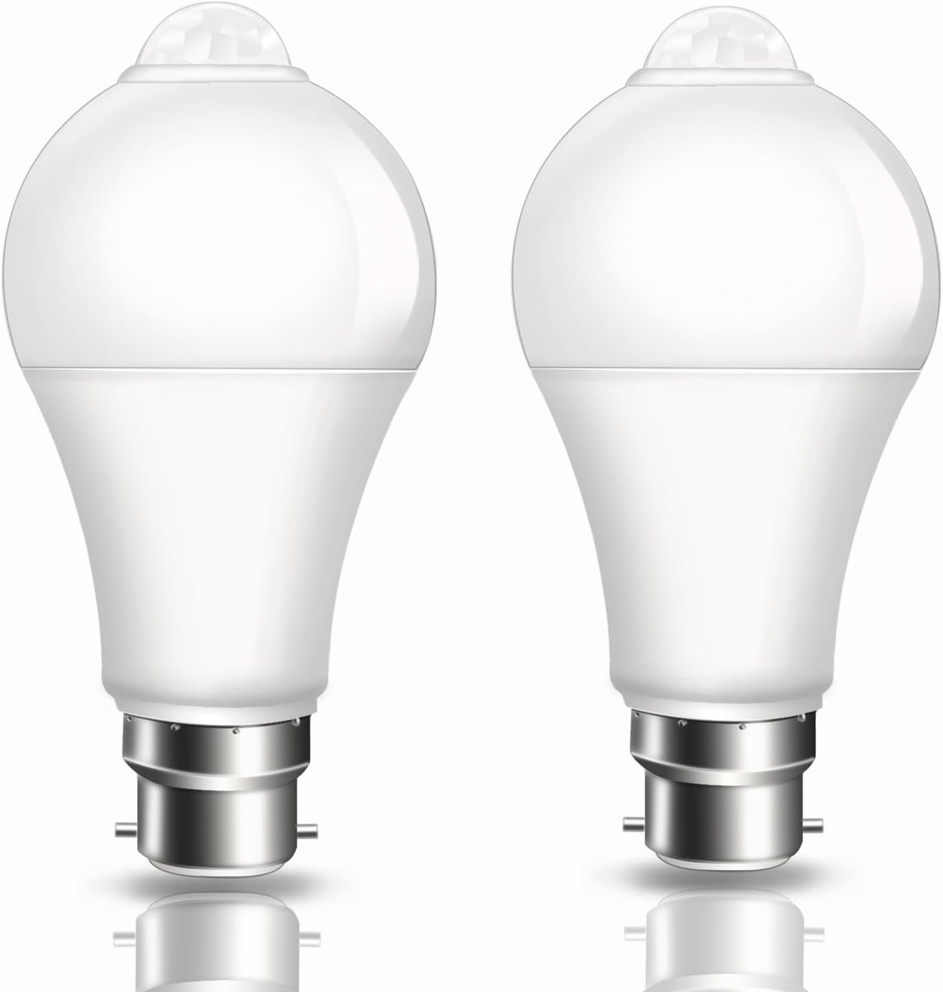 PIR Motion Sensor LED Bulbs 9W, BC B22 Bayonet Light Bulbs Cool White 6500K, Equivalent 60W, Auto On/Off B22 Motion Sensor Light Bulb for Garage, Stairs, Hallway, 2 Pack
