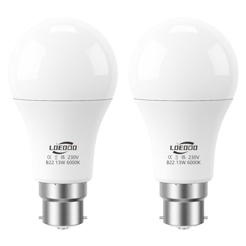 LOEODO B22 Bayonet LED Bulbs 100W Equivalent, 13W Light Bulb, 1200 Lumens, 6000K Cool White, A60 Energy Saving Lightbulbsb, Non-Dimmable, Pack of 2