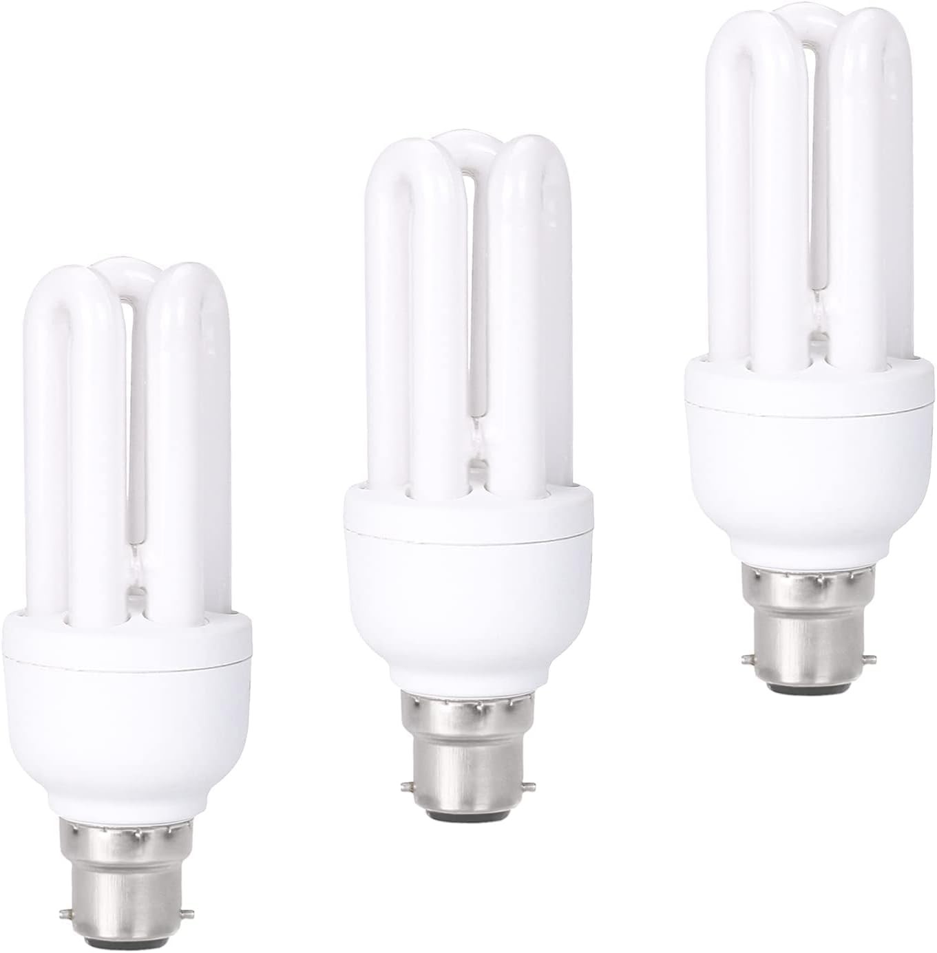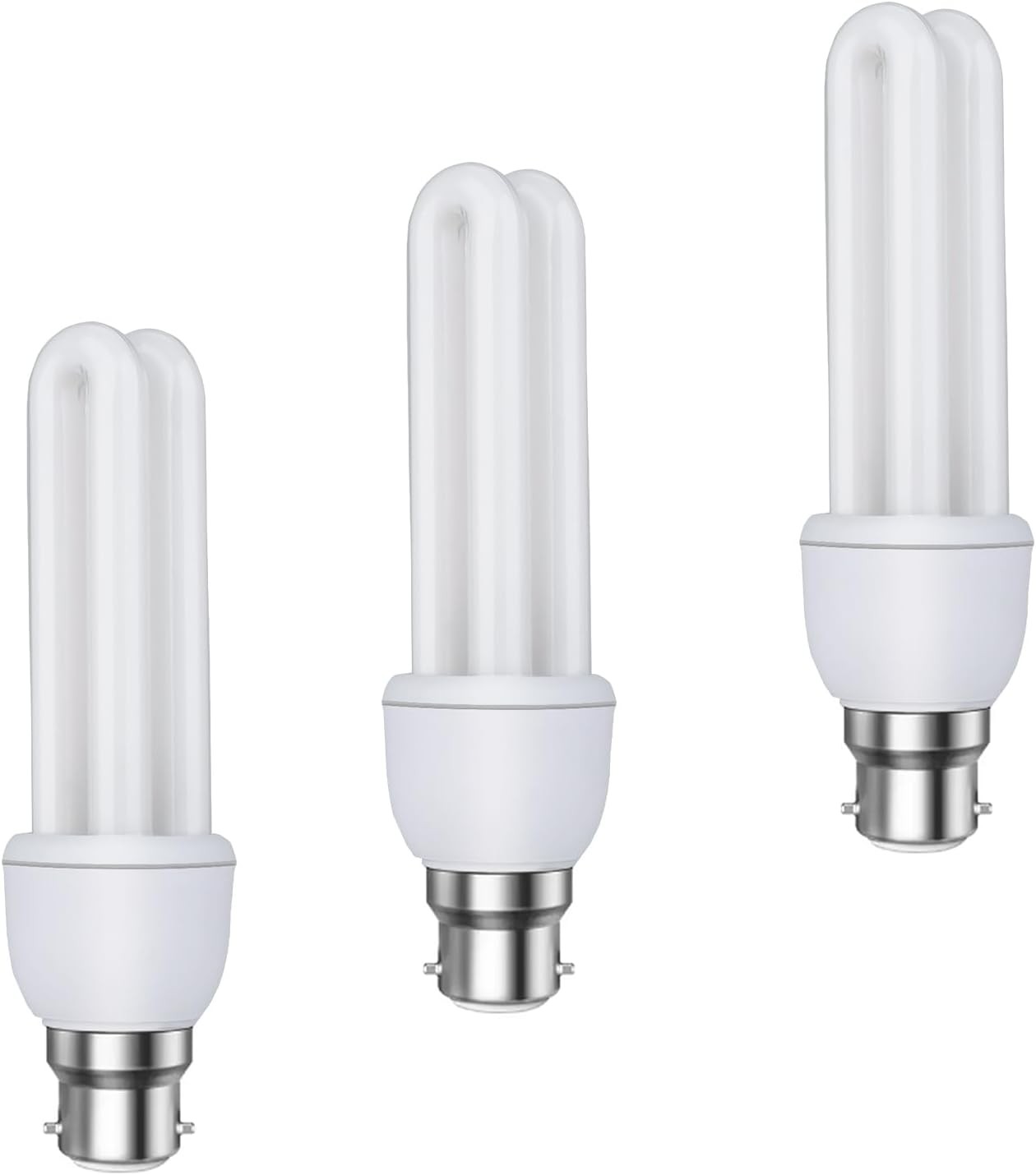 3 Pack 11W Equivalent to 60W, Daylight White 6400K B22 Bayonet Bulbs, B22d Bayonet Cap, 3U CFL BC Compact Fluorescent Stick Bulbs