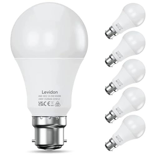 Levidon Bayonet Light Bulbs 100W Equivalent, Cool White 6500K,13.5W 1520LM Super Bright LED Bayonet Bulb, Daylight B22 LED Bulbs, BC GLS Energy Saving Lightbulbs Bayonette, Non-dimmable, Pack of 6