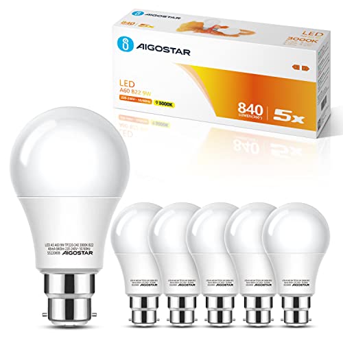 Aigostar Bayonet Light Bulb 62W, B22 LED Bulbs Warm White 3000K, 9W BC GLS Energy Saving Light Bulbs Bayonet, 840lm LED Bayonet Light, 5 Pack