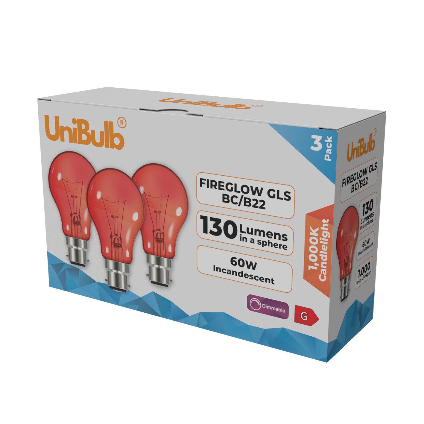 UniBulb B22 / BC GLS Red Fireglow Bulbs 60W Bayonet Cap – 3 Bulb Pack