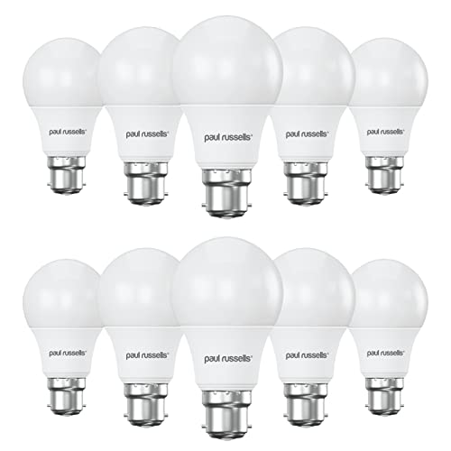 paul russells LED GLS Light Bayonet Cap BC, 60w Equivalent, 8watt 806LM LED Bulbs, 6500K Daylight Lamp, Classic Frosted A60 Standard B22 Energy Saving Non-Dimmable Large Globe Lightbulbs, Pack of 10