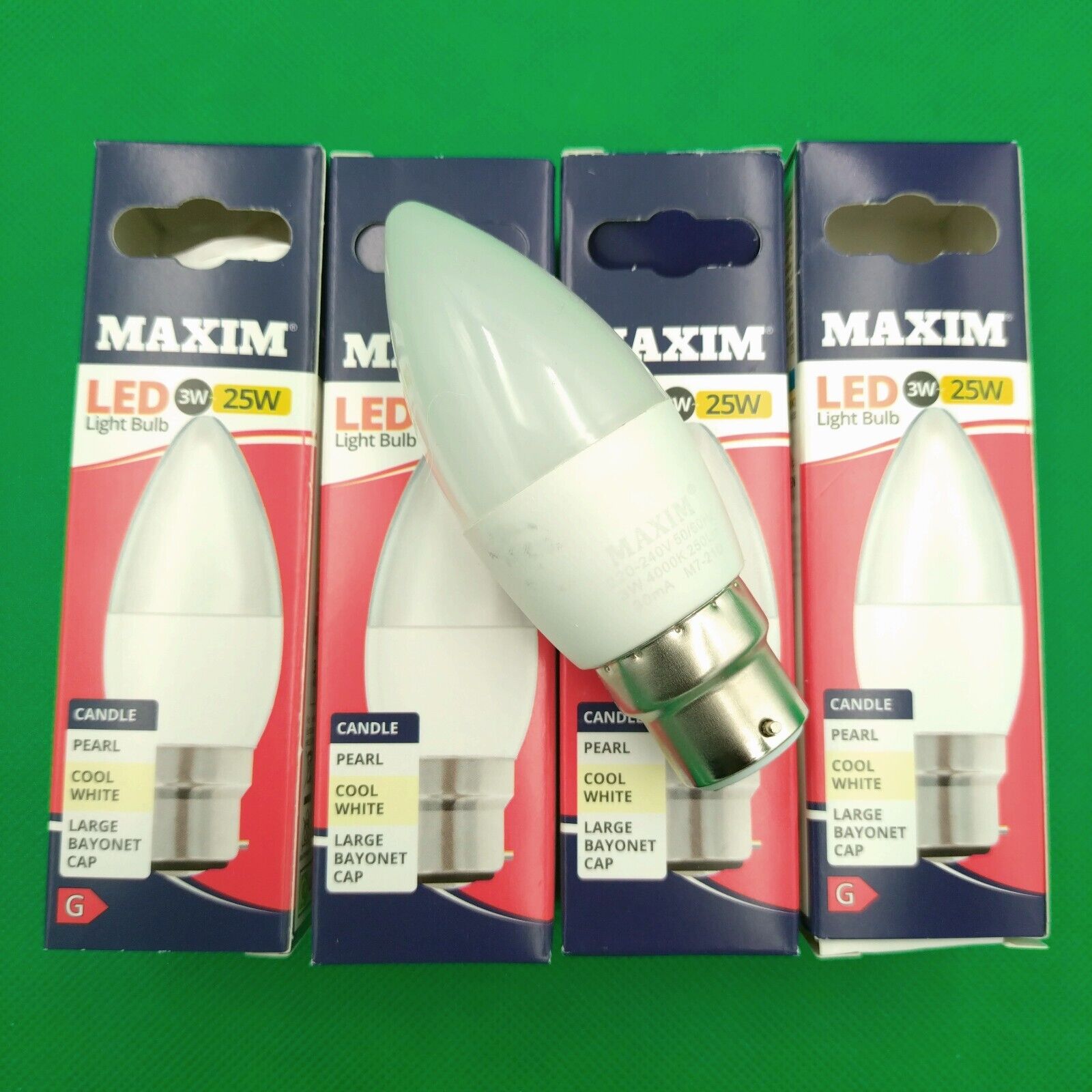 4x Maxim 3w = 25w LED Candle Bulbs Lamps BC Bayonet Cap B22 Cool White Light