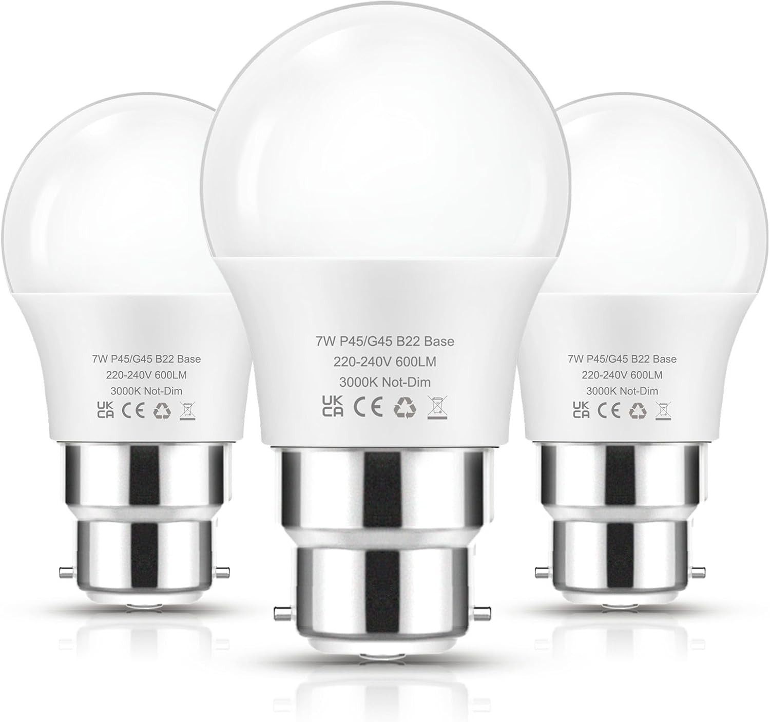 Flaspar Bayonet Light Bulb 60W, 7W B22 LED Bulbs Bayonet Cap Warm White 3000K, G45 P45 Energy Saving Golf Ball Lightbulbs, Non-dimmable, 3 Pack