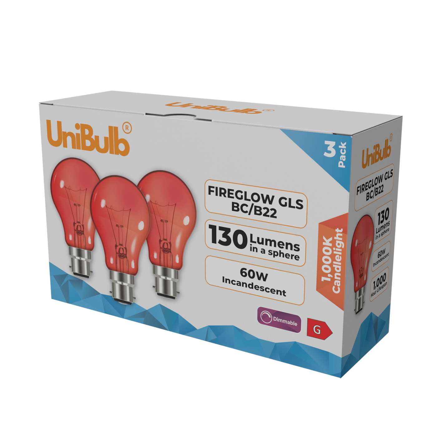 UniBulb Bayonet Cap GLS Fireglow 60W Bulbs B22 / BC Red Light – 3x Pack