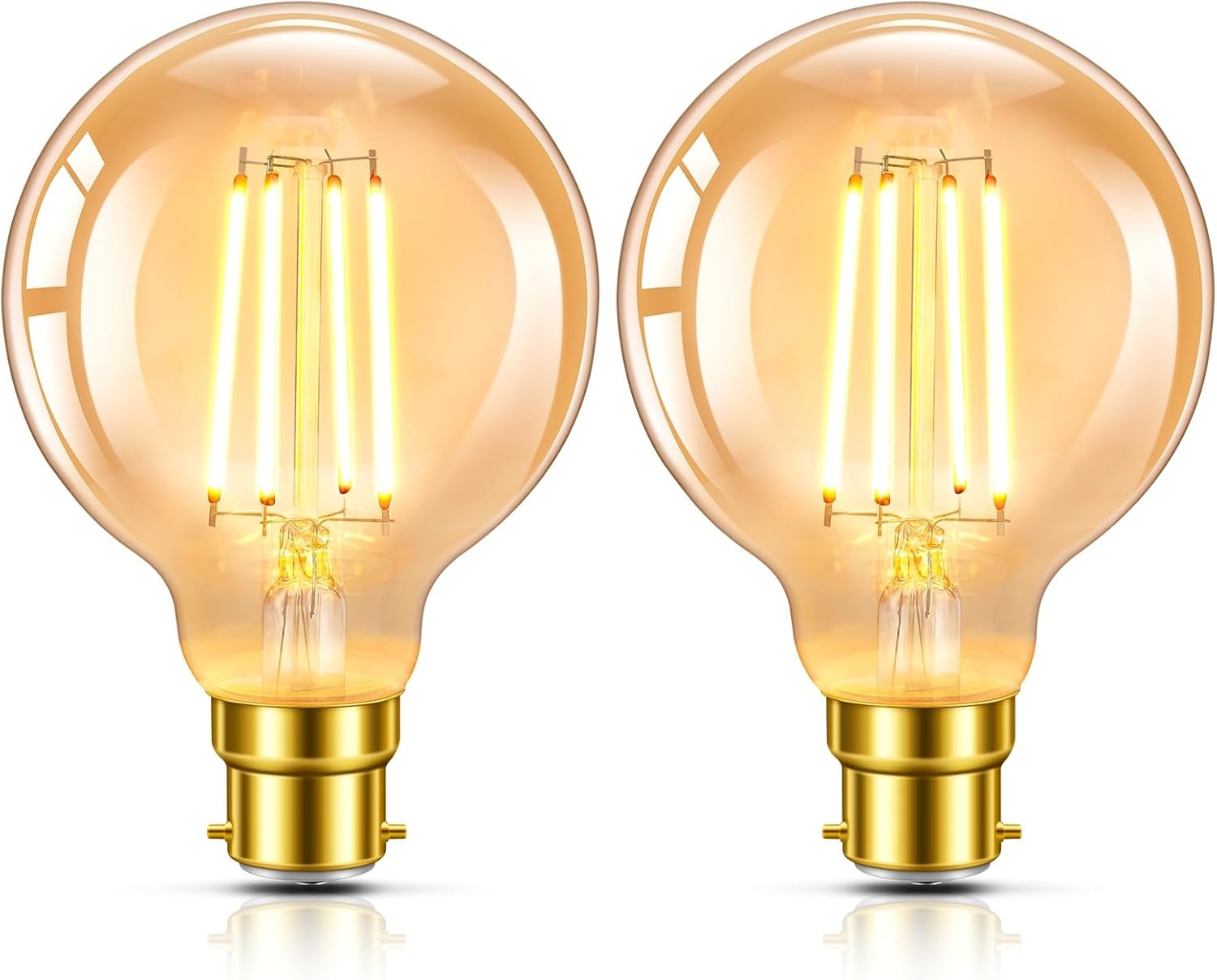 YUNRRD Vintage Bayonet Light Bulb 6W(60W Equilavent),G80 B22 LED Edison Light Bulbs Bayonet Cap,Warm White 2700K B22 Bulb,600LM,Amber Retro Energy Saving Filament Decorative Bulbs,220-240V,Pack of 2