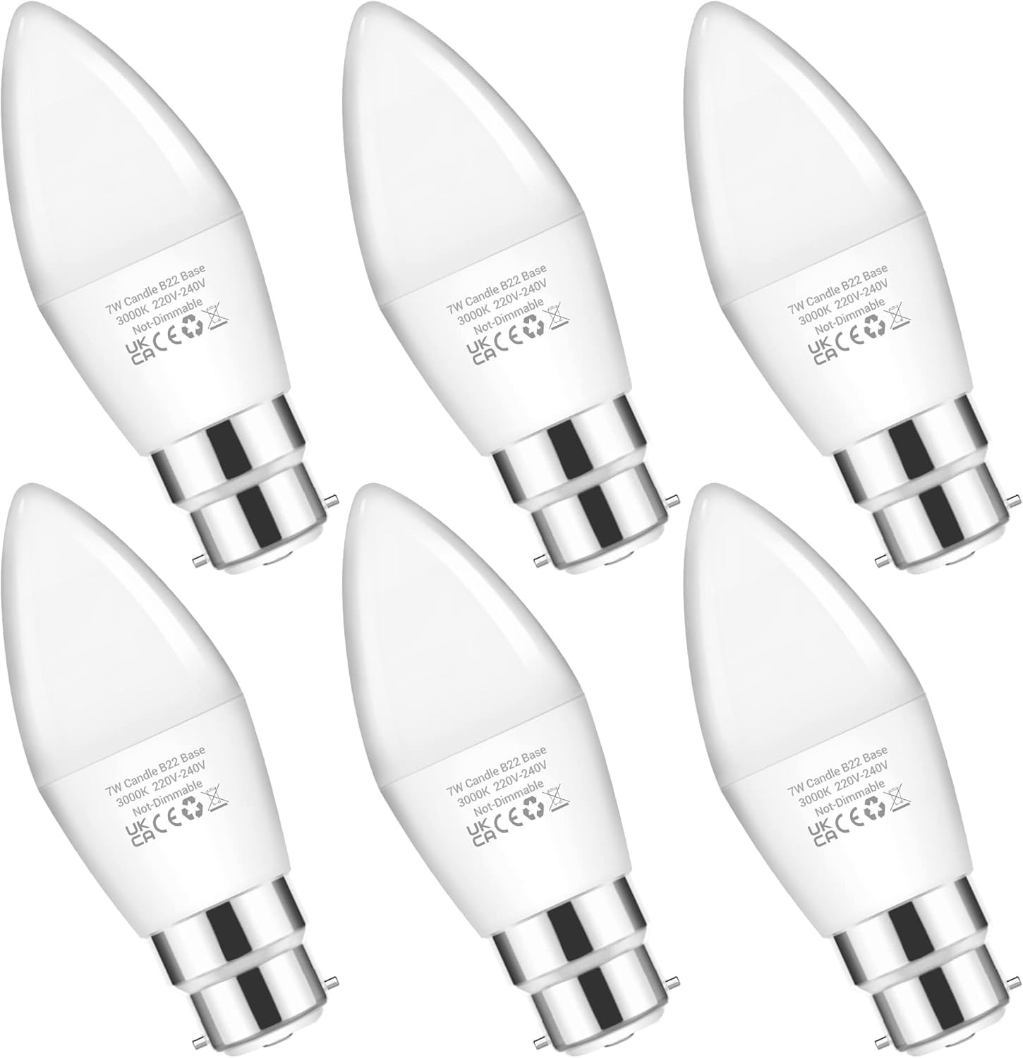 Flaspar Bayonet Light Bulbs 60W Equivalent, 7W B22 Candle LED Bulbs Bayonet 3000K Warm White, 600LM, B22 LED Bulb for Chandeliers, Wall Lamps, Ceiling Fixtures, 6 Pack