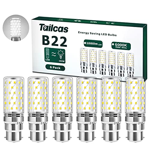 Tailcas B22 LED Bayonet Light Bulbs, 12W Bayonet LED Bulb 6000K Daylight White (Equivalent 100W 150W), 1000Lumen, Not Dimmable,230V Bayonet Cap Energy Saving Bulbs for Home Lighting, Pack of 6