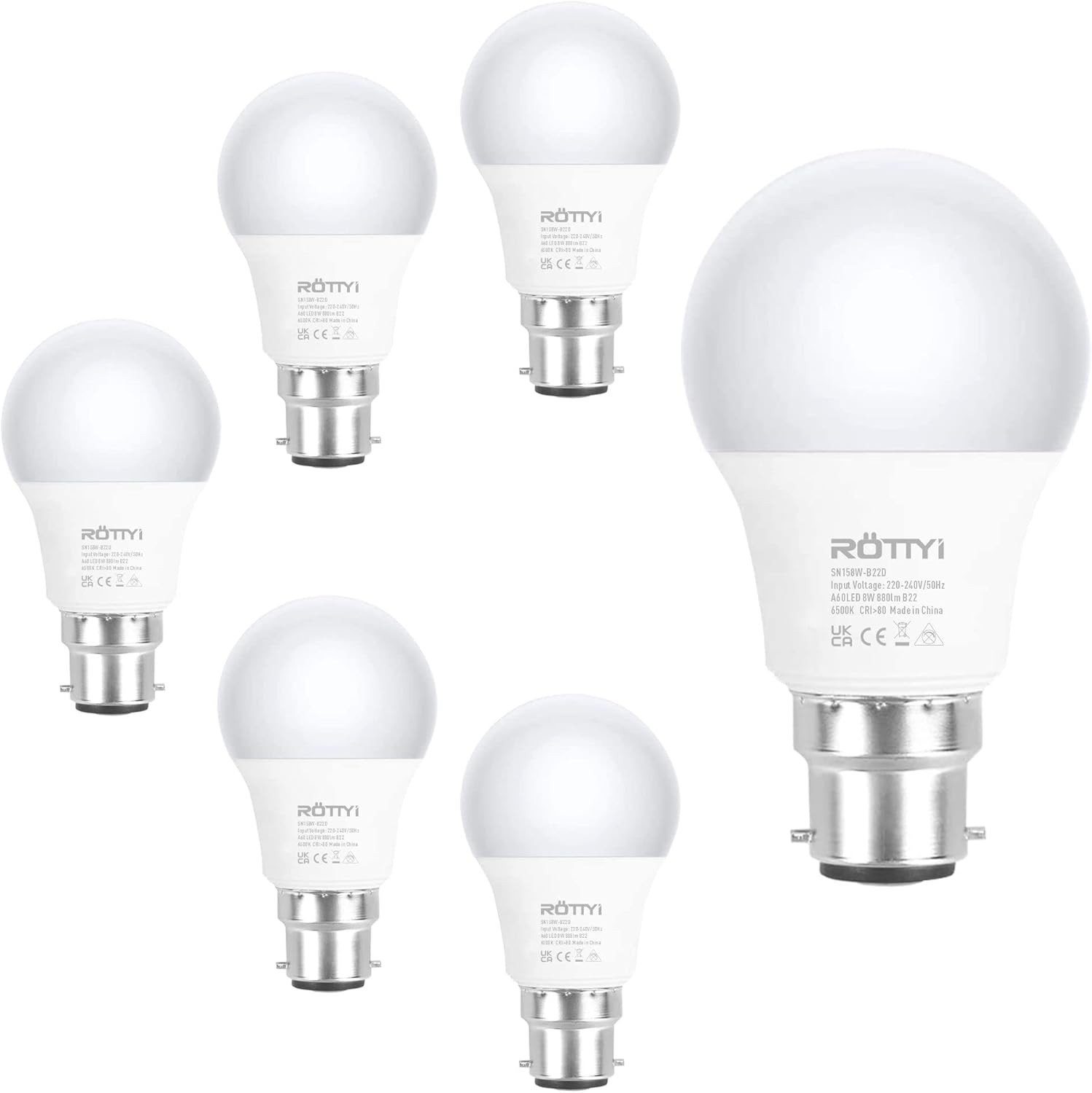 ROTTYI B22 Bayonet Light Bulbs 60W Equivalent, Cool White 6500K Daylight Bulbs,