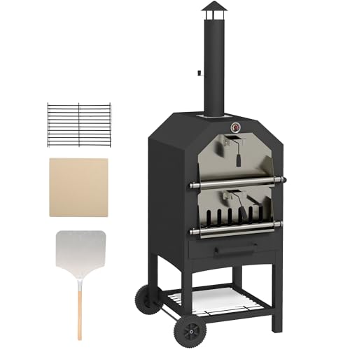 HOBBYZOO Outdoor Pizza Oven Stand, Smoker BBQ Stand with Pizza Stone, Peel, Grill Rack - Camping Oven with Chimney for Heat Control, Wheels & Storage, Charcoal Grill for Garden Patio