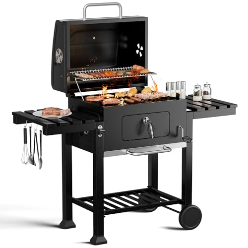 Warmiehomy XXXL Charcoal Barbecue, Outdoor Smoker BBQ Grill with Wheels, 2 Foldable Side Tables, Hooks, Thermometer & Adjustable Chimney, Portable BBQ Grill for Garden Picnic Camping