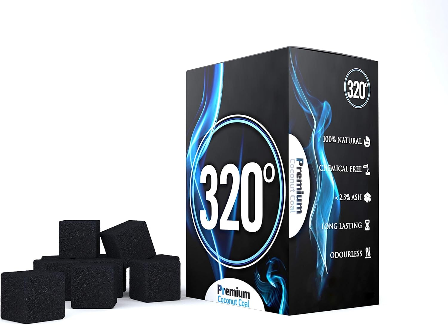 320° Premium Shisha Coconut Charcoal Coal (26mm Cube) for Hookah BBQ - 1 kg - 64 Pieces Nicotine Free