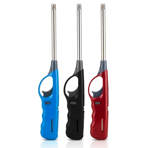 Pack of 3 Long Reach BBQ Lighter Refillable Gas Lighter Windproof Adjustable Flame Kitchen Candle Hob Grill Fireplace Camping Lighter with Safety Lock Assorted Colours