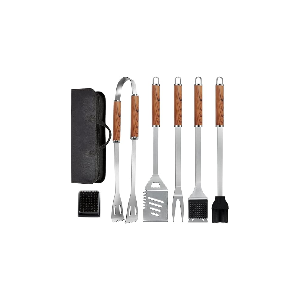 Trongle BBQ Tools Set, 7pcs Stainless Steel Grilling Accessories with Carrying Bag, Wood-Grain Durable BBQ Utensils for Outdoor Cooking, Camping, and Picnics, BBQ Accessories Kit for Men Women Gift