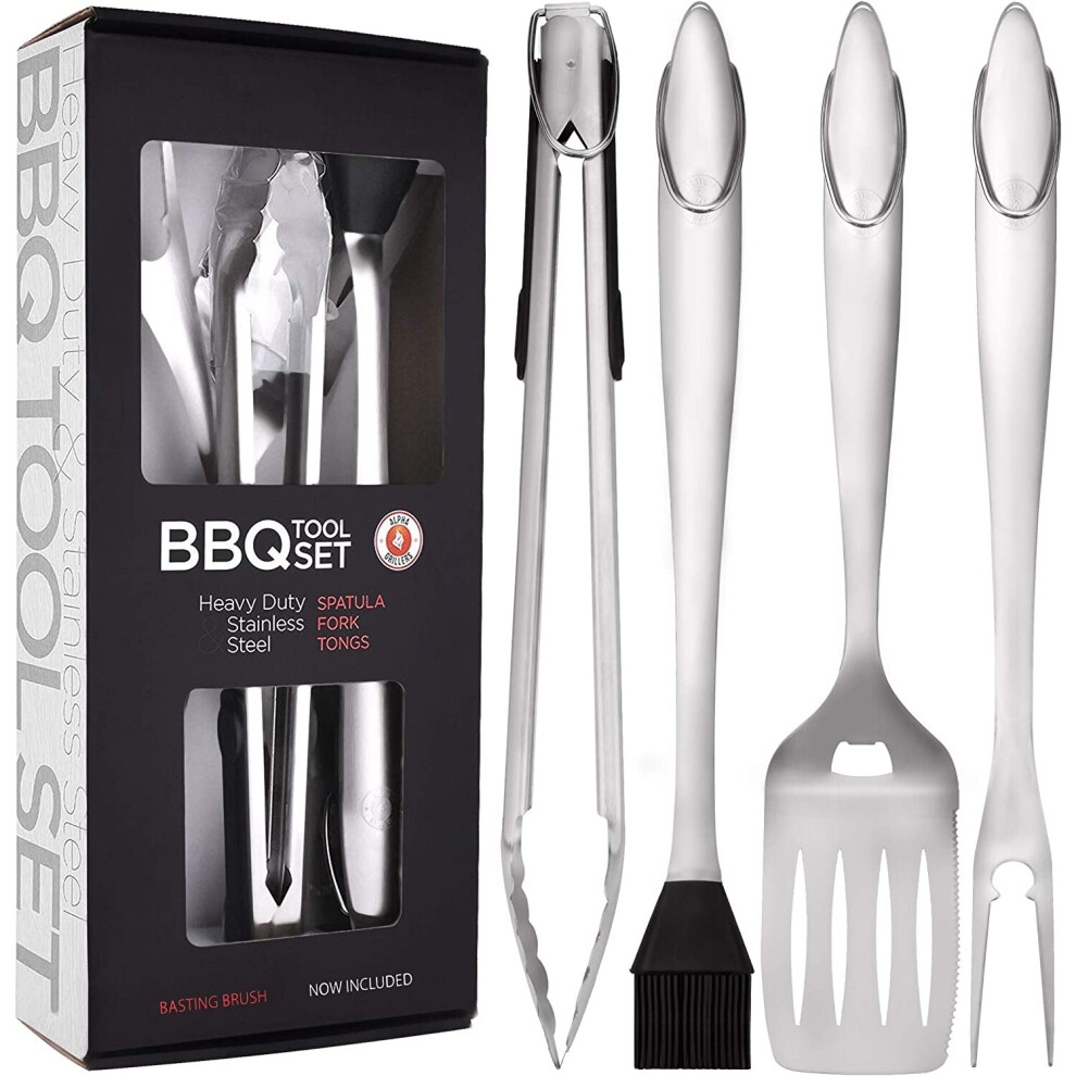 Alpha Grillers Heavy Duty BBQ Grilling Tools Set. Extra Thick Stainless Steel Spatula, Fork, Basting Brush & Tongs. Gift Box Package, 18 Inch