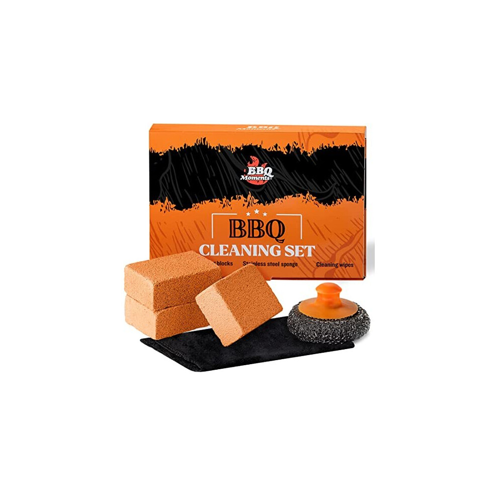 BBQ Moments BBQ Cleaning Tools, Stainless Steel Grill Cleaning Brush, Scrubber Block Pumice Stone & Compressed Towel Tablet Set - 3 Pcs Barbecue