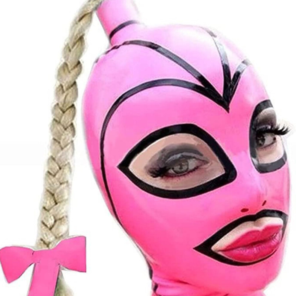 Pink Natural Latex Hood Rubber Mask with Wig, Back Zipper, XL Size 70CM, Fetish BDSM Role Play Costume