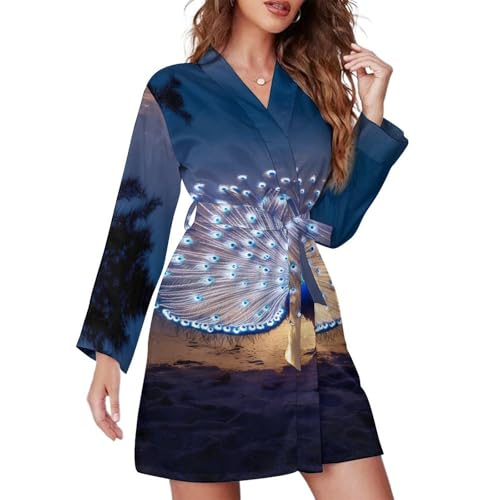 Peacock on Beach Women's Print Robe Long Sleeve Belted Night Robes Sleepwear Loungewear Nightwear